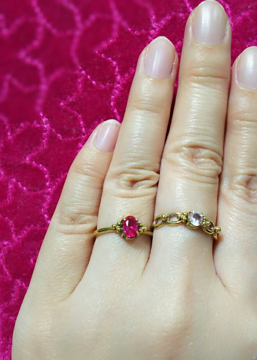 ルビーのリングと、ルース変更でお作り致しましたモルガナイトのリング。