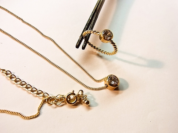 覆輪留めのネックレスとリングを試作しました。
